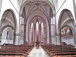 In Richtung des geosteten Chores rahmt ein Triumphbogen die eingezogene, sterngewölbte Chorzone mit dem Polygonchor. Die monumentalen Lanzettenfenster des Chorpolygons wurden beim Wiederaufbau der kriegszerstörten Kirche fast bis auf die Höhe des Fußbodens heruntergezogen und so in ihrer beeindruckenden Wirkung noch gesteigert.