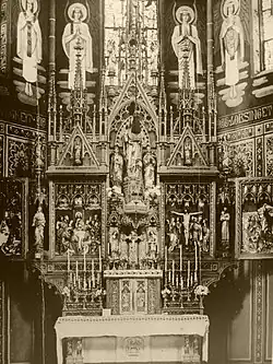 Innerhalb des sakralen Raumes bildete der Hochaltar zugleich Zielpunkt und Fokus. Er korrespondierte mit den Wandmalereien der Apsis, den übrigen neogotischen Ausstattungsstücken und der architektonischen Hülle. Der Altar wurde im Jahr 1955 abgebaut.[44] Theologisches Zentralthema des Malstatter Hochaltares, der die ‚Purifikationsmaßnahmen‘ der Nachkriegszeit nur in seinen Relieftafeln und Einzelfiguren überstanden hat, war die Botschaft der göttlichen Liebe, die in der Schilderung und Inbezugsetzung biblischer Szenen sowie der Darstellung von Heiligen der Nächstenliebe ihren Ausdruck fand.