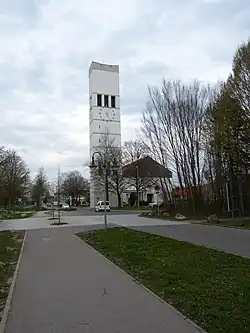 Der weithin erkennbare separate Kirchturm – das höchste Bauwerk der Stadt – gilt als Landmarke. Die Glocken stammen aus der Passauer Glockengießerei Rudolf Perner. Auf dem Turm steht ein goldenes Kreuz. An den vier Stirnseiten des Turmes sind die Ziffernblätter einer Turmuhr angebracht. An der Außenmauer des Kirchturms findet sich folgender Spruch Freundorfers: