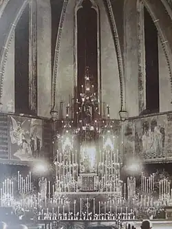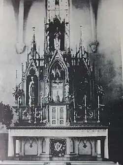 Der reich mit gotischen Gesprenge geschmückte Hochaltar hatte einen steinernen Altarunterbau mit Säulen und Arkaden, einer Predellazone mit Medaillons und Tabernakel. In der Retabelzone war mittig eine Expositoriumsnische; darin ein Kruzifix flankiert von anbetenden Engeln. In den beiden Seitennischen befanden sich Statuen des heiligen Josef mit Kind und des heiligen Wendelin als Hirten. In der darüber liegenden Nische stand eine Herz-Jesu-Statue.[24][25] Links und rechts des Hochaltares standen leuchtertragende Engelsstatuen.[26]