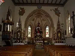 Die neugotische Saalkirche wurde 1870–74 erbaut und 1985–88 renoviert. Sie besteht aus einem Langhaus, einem eingezogenen, dreiseitig geschlossenen Chor im Osten, an dessen Nordwand die Sakristei angebaut ist, und einem Kirchturm im Westen der Nordseite des Langhauses. Die neugotische Kirchenausstattung ist vollständig erhalten. Die Orgel auf der Empore wurde 1954 von Michael Weise gebaut. Unter der Empore steht ein Opferstock aus Granit von 1769.