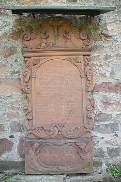 An der Nordseite des Chors ist ein dreiteiliges barockes Grabdenkmal von Martin Heurath (1604–1661) und seiner Frau Petronella aus rotem Sandstein aufgestellt.[13] Das mittlere Schriftfeld unter einem Rundbogen hat in den Zwickeln zwei geflügelte Engelköpfe und wird außen von Rocaillen gerahmt. Das geschwungene Kopfteil über einem Architrav zeigt das Ehepaar vor dem Gekreuzigten kniend, flankiert von Voluten. Der verwitterte Sockel trägt in einem Medaillon, das von zwei Drachen gehalten wird, eine Inschrift mit dem Bibelwort aus Offb 14,13 .
