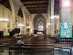 Der Chorraum ist vom Hauptschiff über drei Stufen erreichbar und enthält den Altar. Hier ist ein Ölgemälde mit der Kreuzigungsgruppe zu sehen. Die Kirchenschiffe sind nicht wie üblich durch Säulen, sondern durch Pfeiler in Spitzbogenform abgetrennt. Der Kirchenraum wird von einer Holzkassettendecke abgeschlossen.[2]