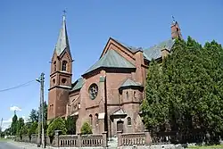 Der Kirchenbau aus Backstein entstand im neoromanischen Stil. Die Kirche besitzt drei 1968 angefertigte Glocken: Göttliche Vorsehung, St. Hedwig und St. Joseph.
