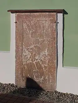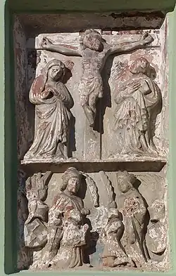 Nahezu ebenso alt sind zwei gotische Reliefs, die an der südlichen Außenmauer des Langhauses angebracht sind. Sie wurden um 1415 aus Kelheimer Marmor gearbeitet. Das eine Relief ist ein rund zwei Meter hoher und ein Meter breiter Epitaph für den Dekan Ulrich Ziegelhauser († 1415). In der Mitte ist ein großflächiges Wappen mit Helmzier dargestellt. Das andere, ebenfalls hochrechteckige Steinrelief umfasst zwei übereinander angeordnete Rechtecknischen. In der oberen, etwas größeren Nische ist eine Kreuzigungsgruppe mit Maria und Johannes dargestellt. Im unteren Feld sind stehend die Heiligen Kastulus (links) und Katharina (rechts) sowie kniend zwei Angehörige des Geschlechts der Ziegelhauser zu erkennen. Auf beiden Seiten befindet sich je ein kleines Wappen mit Helmzier.[2]