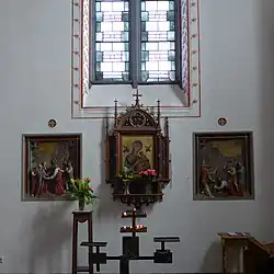 Der Chorraum wurde im Jahr 1980 bis 1981 neu gestaltet. Dabei wurde der Marmoraltar des Jahres 1963 ausgebaut und durch einen Altar des Trierer Bildhauers Willi Hahn ersetzt. Hahn schuf ebenso die Tabernakelstele und den Ambo.[59][60]