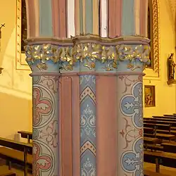 Als man am Orgelgehäuse Spuren einer früheren farblichen Fassung und Vergoldung gefunden hatte, empfahl das Trierer Amt für kirchliche Denkmalpflege, auch die Innenflächen des Kirchengebäudes auf das Vorhandensein von historischer Bemalung zu untersuchen. Dabei stellte sich heraus, dass die historistischen Ausmalungen der Kirche noch unter den späteren Anstrichen überdauert hatten. Als man sich daraufhin mit dem Vorhaben trug, die historistischen Wandmalereien wiederherzustellen, kam die Frage auf, welche der beiden Raumfassungen man rekonstruieren sollte. Zur Debatte standen drei Möglichkeiten: Zum einen die Wiederherstellung der Raumfassung von 1878 unter Konservierung und Übermalung der Fassung von 1907, die Rekonstruktion der Malereien von 1907 oder eine Kombination der Fassungen von 1878 und 1907. Schließlich entschied man sich für die letztgenannte Möglichkeit und beauftragte die Tholeyer Firma Mrziglod, die auch noch die vorhandenen Einrichtungsstücke nach Befund wieder farbig fasste.[57] Von der ersten Ausmalung Fröhlichs übernahm man die bunten Pfeiler, Wandvorlagen, Rippen und Schlusssteine. Von der zweiten Raumfassung Kleins übernahm man die Gestaltung der Gewölbe, den umlaufenden Fries und die Fenster- und Rippenrahmungen. Neu ergänzt wurden die weiß gestrichenen unteren Wandflächen im Chorbereich und den Seitenschiffen.[58]