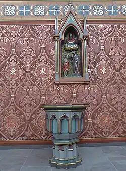Die Ausmalung des Kircheninneren nahm von 1878 bis 1882 der Merziger Kirchenmaler Johann Georg Fröhlich vor. Die Beauftragung datiert auf den 8. Juli 1878.[51] Fröhlich fasste die Gewölbe ultramarinblau und besetzte die Flächen mit vergoldeten Sternen von neun Zentimetern Durchmesser. Der Chorbereich wurde mit Teppichmalereien ausgeschmückt. Die Fensterlaibungen, Gurte und Dienste versah Fröhlich mit bunten Ornamenten, die teilweise Vergoldungen aufwiesen. Die Pfeiler des Mittelschiffes wurden rot getönt. Auch dessen Wandflächen wurden bis zur Höhe der Kapitelle rot angestrichen. Die Wände der Seitenschiffe versah Fröhlich bis zur Höhe der Fenster mit einem bunten Teppichmuster, während er die darüberliegenden Flächen mit einem Quadermuster bemalte. Passend farbig gefasst und teilweise vergoldet wurde im Zuge dieser Maßnahme auch die Kirchenausstattung. Insgesamt hüllte die Raumfassung Fröhlichs den Sakralraum in ein mystisch-abgedunkeltes festliches Farbenspiel. Im Jahr 1882 berichtete der damalige Wallerfanger Pfarrer Karl Joseph Petry dem Trierer Generalvikariat über das Zustandekommen der farblichen Fassung des Kirchenraumes: „Obwohl die Kirche noch neu ist, hatte sich in Folge des zwar soliden, aber rauen Verputzes eine solche Menge Staub an den Wänden festgesetzt, und an verschiedenen Stellen dermaßen geschwärzt, daß das Innere der sonst schönen Kirche die Würde vermissen ließ, welche dem Gotteshaus doch vor allem geziemt; ich hielt es deshalb für meine Pflicht, nicht länger auf die Einwendungen zu achten, welche einflussreiche Persönlichkeiten gegen die Dekoration der Kirche überhaupt erhoben ... und forderte zu freiwilligen Beiträgen auf.“[52]