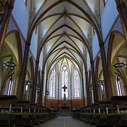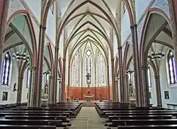 Die heutige Kirche St. Katharina und St. Barbara wurde im Stil der Neogotik errichtet. Bei der architektonischen Grundform des Kirchengebäudes handelt es sich um eine Basilika mit querhauslosem Langhaus, hohem Mittelschiff und zwei niedrigeren Seitenschiffen. Mittel- und Seitenschiffe sind in fünf Joche unterteilt. Das erste Joch vom Turmportal aus gesehen wird ganz von der Orgelempore gefüllt. Die Emporenbrüstung reicht bis zur halben Höhe der Scheidarkaden des Mittelschiffes. Die Scheidarkaden erheben sich bis zur Hälfte der Raumhöhe. An das Langhaus schließt sich in gleicher Gewölbehöhe ein Chorjoch ohne Seitenschiffjoche an. Die gleich hohe Apsis rundet sich in einem Fünf-Achtel-Polygon. Die Seitenschiffe enden flach in Höhe des Beginns des Chorjoches. Die Decken der Schiffe werden von diagonal angeordneten Kreuzrippengewölben geformt. Die Joche sind durch Scheidebögen voneinander getrennt. Die Gewölberippen ruhen auf Rundpfeilern mit vorgelegten schlanken Runddiensten. Im Mittelschiff sind die Kapitelle der Dienste in Höhe der Scheitel der Scheidarkaden und unterhalb der Kämpferlinie der Mittelschiffgewölbebögen positioniert und bildet so eine Bogenstelzung im Mittelschiff. Dadurch sind die Gewölbekappen vergrößert und die Schildbögen mit den kleinen Obergadenfenstern erhöht. Zwischen den Obergadenfenstern und den Scheidarkaden liegen große Wandflächen ohne Gliederung. Die zweibahnigen Maßwerke der Obergadenfenster orientieren sich in vereinfachter Form an der Maßwerkgliederung der Chorfenster. Die Bahnen enden in gotischen Spitzbögen mit eingestellten Nasen. Darüber erheben sich in abwechselnder Reihenfolge liegende und stehende Vierpässe. Ähnlich sind die Fenster der Seitenschiffe ausgebildet. Hier variieren im oberen Spitzbogenbereich Dreipässe, liegende oder stehende Vierpässe und Fünfpässe.