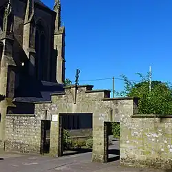 Die neogotische Kirche verfügte seit dem Jahr 1872 über eine kleine, eingeschossige Sakristei an der Nordseite des Chores. Die neogotischen Fensterreihen orientieren sich an mittelalterlichen Fensterformen der Moselregion, wie sie in Metz und Trier üblich sind. Als Entsprechungsbau in gleicher Formensprache fügte der Saarlouiser Architekt Peters der Südseite des Chores im Jahr 1933 eine zusätzliche Sakristei an. Darüber hinaus errichtete man einen triumphbogenähnlichen Torbau, bei dem eine mittlere, gerade schließende Durchfahrt von zwei ebenso schließenden Durchgängen flankiert wird. Der flach angelegte Staffelgiebel der mittleren Durchfahrt wird von einem Christogramm aus Schmiedeeisen bekrönt.[54]