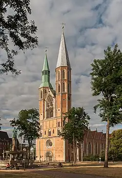 Charakteristisch ist der Westbau, der wie beim Braunschweiger Dom als Sächsischer Westriegel konzipiert war. Dem zunächst rein romanischen Unterbau folgt dann ein frühgotisches, weiteres Geschoss, auf der nächsten Ebene folgt dann das hochgotische Glockenhaus mit den spätgotischen Türmen. Durch die Reformation und die Abschaffung der Ablassgelder wurde der Bau nicht vollendet, der Nordturm blieb, wie bei der Andreaskirche, unvollendet.