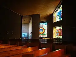 Tageslicht fällt durch Bleiglasfenster in leuchtenden Farben, darunter das 16 Meter hohe Chorfenster, das sich auf die Geheime Offenbarung vom himmlischen Jerusalem bezieht. Ein großes Kruzifix aus Lindenholz im Altarraum zeigt den verklärten, wiederkommenden Christus. Weitere Ausstattungsstücke sind der Tabernakel, eine Madonna mit Kind und der Taufstein aus Bronze.[4]