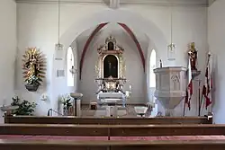 Der Hochaltar stammt aus dem letzten Viertel des 17. Jahrhunderts. Er hat einen marmorierten Holzaufbau mit vergoldetem Dekor, bestehend aus zwei korinthischen Säulen mit einem verkröpften waagrechten Gesims und zwei rundbogigen Giebelschenkeln. Im Mittelfeld befindet sich das rundbogig gerahmte Altarbild. Es zeigt ein Kruzifix mit der schmerzhaften Muttergottes. Das Ölgemälde aus dem späten 18. Jahrhundert befand sich ursprünglich in der Schlosskapelle in Dankenfeld. Den oberen Abschluss bildet ein Auszugsrahmen mit einem Gesims und einem Obelisk. Darin befindet sich ein rundbogig geschlossenes Tafelbild, in Öl auf Leinwand, das die Marienbekrönung darstellt. Der Tabernakel mit neubarockem Gehäuse ist modernen Ursprungs.[2]