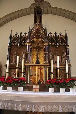 Die Farbfenster und die Ausstattung stammen überwiegend aus der Zeit um 1900. Bemerkenswert ist die Holzfigur einer Immaculata vom Ende des 17. Jahrhunderts.