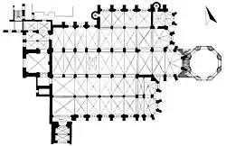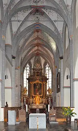Ab dem Beginn des 14. Jahrhunderts erfolgte eine grundlegende Umgestaltung des Kirchenraums durch den Anbau eines Chorraums im Stil der Hochgotik mit 5/8-Schluss und Maßwerk-Fenstern. Das Ende der Bauarbeiten ist in die zweite Hälfte des 14. Jahrhunderts zu datieren.[11] Schon ein Jahrhundert zuvor waren in der zweiten Hälfte des 13. Jahrhunderts Kämpfergesims, Bögen und Obergaden des Mittelschiffes im gotischen Stil erneuert worden.