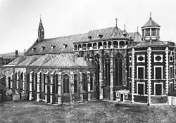 Nachdem Kirche und Kloster 881 und 892 bei Normanneninvasionen zerstört worden waren, erfolgte Ende des 10. Jahrhunderts unter Otto III. ein Neubau der Kirche als dreischiffige, romanische Pfeilerbasilika mit zweigeschossigem Westbau. Die flache Holzdecke des Baus wurde durch quadratische Pfeiler mit einer Seitenlänge von 0,8 Metern[6] getragen. Zu Beginn des 13. Jahrhunderts wurde das Martyrium niedergelegt, um Platz zu machen für eine einschiffige Pilgerkirche mit separatem Eingang an der Südseite. Dieses Ensemble beschädigten Aachener Bürger 1310 in einer Fehde zwischen der Stadt Aachen und Gerhard V., dem Grafen von Jülich. Dieser war nicht nur Vogt von Aachen, sondern auch Vogt der Abtei, die ihn im Kampf gegen die Aachener unterstützt hatte.[11] Die Beschädigungen am Kloster scheinen jedoch nicht allzu groß gewesen zu sein, denn die Stadt hatte dafür später nur eine recht kleine Entschädigung zu zahlen.[12] Von der Abteikirche wurde dabei nur der Westbau in Mitleidenschaft gezogen, dessen Wiederaufbau ein von nun an geschlossenes Erdgeschoss[13] und eine Westfassade aus Blaustein mit sich brachte.