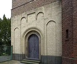 Der erhaltene romanische Teil des Turms ist aus Tuffstein errichtet. Er ist durch Vertikallisenen gegliedert, die durch auf- und absteigende Rundbogenfriese verbunden sind. Den Abschluss der mittleren Blende bildet ein rechtwinkelig gebrochener Fries. An der Westseite liegt ein rundbogiges Portal.