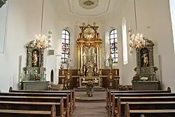 Der Innenraum ist barock ausgestaltet und durch den reich verzierten Altar geprägt. Vor den hell verputzten Wänden setzt sich der figürliche Schmuck ab. Die drei Altäre stammen aus der alten Kirche. Die Seitenaltäre wurden im Jahr 1608 und der Hochaltar 1700 geschaffen und 1770 ergänzt. Die Kanzel wurde zur Bauzeit gefertigt.