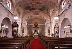 Der bemerkenswerteste Teil der Ausstattung ist der neubarocke Hochaltar, der von Karl Dörr aus der Saulgauer Holzschnitzerwerkstatt geschaffen wurde. Dörr zeichnet auch für alle anderen holzgeschnitzten Kunstwerke in der Kirche verantwortlich.[7]