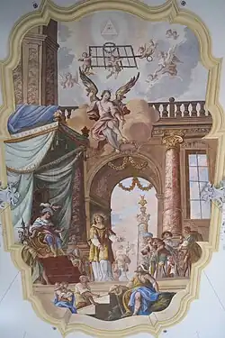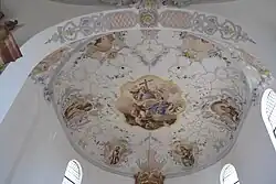 In den größeren Kartuschen der Langhausdecke sind die Evangelisten Matthäus, Markus, Johannes und Lukas (hinter der Orgel) dargestellt. Die kleineren Medaillons zeigen vier emblematische Darstellungen in Grisaillemalerei.