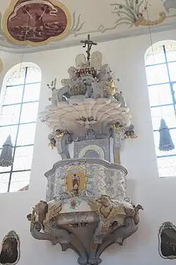 Das bedeutendste Ausstattungsstück ist die ungewöhnliche, farbig gefasste Kanzel aus der Zeit um 1742. Der Kanzelkorb wird von vier Volutenanschwüngen mit den Evangelistensymbolen getragen. Die Brüstung trägt Dekorationen aus Bandelwerk, Blatt- und Blütenranken. Der Schalldeckel hat die Form einer flachen Muschel. Darüber stehen vier Vasen und ein Blumenkorb zwischen Volutenschwüngen. Den Abschluss bilden das Buch mit den sieben Siegeln, das Lamm Gottes, die Gesetzestafeln und die Eherne Schlange am Kreuz.