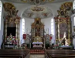 Den Hochaltar mit den seitlichen Scheindurchgängen lieferte 1745 der Hainhofer Schreiner Johann Konrad Rist und erhielt dafür 250 Gulden. Das Altarblatt aus dem 19. Jahrhundert wird von zwei korinthischen Säulenpaaren flankiert.