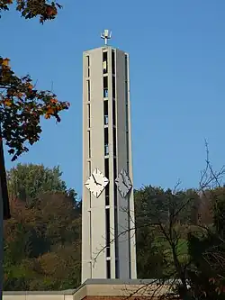 Der 35 Meter hohe Kirchturm birgt seit dem 19. November 1958 vier Glocken, welche in der Glockengiesserei Rüetschi in Aarau gegossen wurden. Es handelt sich um die Christus-, die Marien-, die Apostel- und die Schutzengelglocke. Der Turm wird von einer von Künstler Albert Schilling gestalteten Turmkrone abgeschlossen, die in zweidimensionaler Ausführung auch die Frontseite der Kirche schmückt.[6]