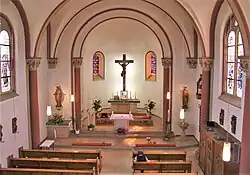 Zur Ausstattung der Kirche gehören der 1958 neu angeschaffte Tabernakel und der Hochaltar aus dem Jahr 1960 im Chorraum, der am 10. Juli des gleichen Jahres von Domkapitular Josef Paulus im Auftrag des damaligen Trierer Bischofs Matthias Wehr konsekriert wurde. Über dem Tabernakel befindet sich ein großes Kreuz.[2]