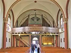 Das Kegelladen-Instrument verfügt über 14 Register, verteilt auf 2 Manuale und Pedal. Die Spiel- und Registertraktur ist elektropneumatisch. Die Disposition lautet wie folgt:[3]