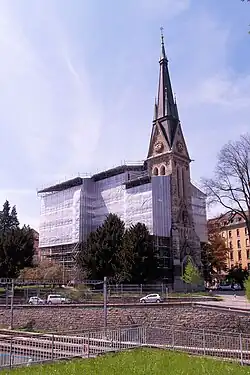 Bevor die Renovation in Angriff genommen werden konnte, brannte am Abend des 20. Dezember 2007 der Dachstock der Kirche vollständig aus. Nur der Kirchturm konnte durch einen Grosseinsatz von etwa 200 Feuerwehrleuten gerettet werden. Gemäss den Untersuchungsbehörden waren Dachdeckerarbeiten, bei denen ein Mottbrand entstand, die Ursache des Feuers.[3][4]