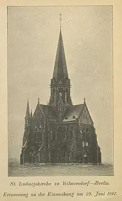 Zu dieser Zeit herrschte wie überall in den neu entstehenden Vorstädten, so auch in Wilmersdorf, eine sogenannte ‚Kirchennoth‘.[5] Vor dem Bau der Menkenschen Ludwigskirche hatte es an katholischen Kirchen lediglich im südlich angrenzenden Schmargendorf eine mittelalterliche Dorfkirche gegeben. Menkens Ludwigskirche war die erste große katholische Kirche, die im Südwesten Berlins entstand. Zeitgleich wurde als erste große evangelische Kirche in Wilmersdorf anstelle der alten, 1772 erbauten, evangelischen Dorfkirche in den Jahren 1895 bis 1897 die Auenkirche als neugotische Backsteinkirche von Max Spitta erbaut, die auch „Christuskirche“ genannt wurde. Ausschlaggebend für den Kirchenneubau war im Jahr 1890 die Bauplatz-Schenkung durch die Wilmersdorfer Terrain-Aktien-Gesellschaft. Der Fürstbischöfliche Delegat Prälat Joseph Jahnel hatte als Repräsentant des Fürstbistums Breslau zur Linderung der Kirchennot in Wilmersdorf den später in Ludwigskirchplatz umbenannten Straßburger Platz geschenkt erhalten.