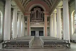 Der Kirchenraum ist eine dreischiffige Halle. Die Seitenschiffe sind flach gedeckt, während sich über dem Mittelschiff ein kassettiertes Tonnengewölbe erhebt, das von zwölf hohen, weißen, kannelierten Säulen getragen wird. Pastellrosa Wandstreifen und schmale Goldbänder setzen farbige Akzente.