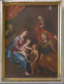 Das Ölgemälde (Öl auf Leinwand, 133 × 178 cm) mit der Darstellung der Heiligen Familie im Eingangsbereich der Kirche stammt noch aus der barocken Pfarrkirche und wurde im Jahr 1687 geschaffen. Das Bild wurde vermutlich im Jahr 1865 aus der abzubrechenden barocken Kirche entfernt und seitdem im Pfarrhaus aufgehängt. Erst nach 1970 kam es wieder in das Böhmsche Kirchengebäude. Das Gemälde zeigt einen Besuch der Familie Johannes des Täufers mit seinen Eltern bei der Heiligen Familie, eine in der Kunstgeschichte selten thematisierte Konstellation, die nicht in der Bibel erzählt wird. So wie die schwangere Jungfrau Maria ihrer Base Elisabeth vor der Geburt des Johannes einen Besuch abgestattet hatte (Lk 1,39-56 ), so besucht jetzt Elisabeth mit ihrem Mann und dem Sohn der Familie die Verwandtschaft in Nazareth. Das Jesuskind sitzt auf dem Schoß der Jungfrau Maria und streckt seine Ärmchen aus, um den ihm zustrebenden kleinen Johannes begrüßend zu umarmen. Johannes’ Mutter Elisabeth, dargestellt als Frau im fortgeschrittenen Alter, unterstützt die dem Jesuskind zugewandte Bewegung ihres kleinen Sohnes. Während Zacharias, der Vater des Johannes, sich in ehrfürchtiger Haltung vor dem Jesuskind verbeugt, blickt Josef in nachdenklicher Haltung auf die Szene, indem er seinen Kopf mit der Hand stützt. Die Gottesmutter Maria mit dem Jesuskind ist als Helligkeitszentrum des Gemäldes gestaltet. Ein aufwirbelnder roter Vorhang am linken oberen Bildrand schließt die einträchtig-friedvolle Komposition ab und gibt den Blick auf eine Landschaftsszene frei. Im Jahr 1832 wurde das Ölgemälde restauriert und ist durch diese Behandlung in der Folgezeit stark nachgedunkelt. Vermutlich im Jahr 1890 war es aus der Kirche entfernt und danach im Pfarrhaus aufgehängt worden.[48]