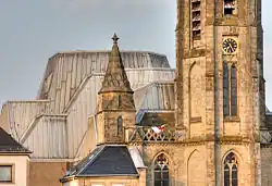 Die beiden Treppentürme von St. Ludwigs in Saarlouis stehen an der Stelle der früheren barocken Turmflankenhauben. Sie entwickeln sich im Obergeschoss vom Quadrat ins Achteck und schließen mit steinernen Helmen.