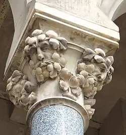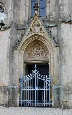 Die Eingangshalle ist in drei große Abschnitte gegliedert. Der Turmeingang ist als mittiger, reich mit Maßwerk gegliederter, wimpergbekrönter Hauptzugang zur Kirche mit einem reliefierten weinrankengeschmücktem Tympanon geschmückt. Im Zentrum des Tympanons erscheint in einem stilisierten Wolkenkranz das triumphierende apokalyptische Lamm Gottes mit Siegesfahne auf dem Buch mit den sieben Siegeln (Offb 5,1 ). Die Konstellation des Lammes mit den Weinranken bezieht sich auf das Jesuswort im Johannesevangelium (Joh 15,5 ): „Ich bin der Weinstock, ihr seid die Reben. Wer in mir bleibt und ich in ihm, der bringt reiche Frucht.“ Darüber hinaus kann die Konstellation des Lammes im Bogenfeld und des Portals in Verbindung mit einer weiteren Stelle im Johannesevangelium gebracht werden: „Ich bin die Tür; wer durch mich hineingeht, wird gerettet werden“ (Joh 10,9 ).