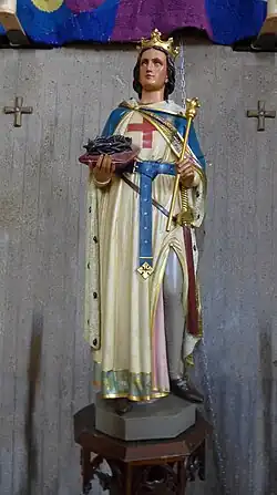Das Ölgemälde (Öl auf Leinwand, 220 × 350 cm) mit der Darstellung der Aufnahme des heiligen Ludwig in den Himmel im Eingangsbereich der Kirche stammt aus dem Jahr 1694 und gehört noch zur Ausstattung der barocken Pfarrkirche. Den Begriff der Apotheose griff das Zeitalter des Barock aus der griechisch-römischen Antike wieder auf. In deren mythologischer Vorstellung wurden heroische Menschen aufgrund ihrer sittlich hervorragenden Taten zu Göttern erhoben, woraufhin ihnen fürderhin mit göttlichen Ehrenbezeugungen gehuldigt werden sollte. Vermutlich diente das Saarlouiser Gemälde als Zentralbild des Hochaltares in der Apsis der barocken Kirche.[49] In der unteren rechten Hälfte des Bildes kniet der heilige Ludwig mit jugendlich-anmutigen Zügen und in demütiger Haltung im königlichen Hermelinornat während des Partikulargerichtes im Augenblick seines Dahinscheidens vor der göttlichen Majestät. Seine rechte Hand hat er auf sein Herz gelegt, während seine Linke auf die Krone Frankreichs und das Königs-Szepter verweist, die beide auf einem prunkvollen Quastenkissen zu Füßen Christi liegen. Der Gestus verdeutlicht, dass der Herrscher Frankreichs alle von Gott durch die Königssalbung empfangene weltliche Macht hinter sich gelassen hat und sie nun in Gottes Hände zurückgibt, um von ihm, wie in der Offenbarung des Johannes verheißen, die „ewige Krone“ zu empfangen: „Sei getreu bis in den Tod, so will ich dir die Krone des Lebens geben.“ (2,10 )