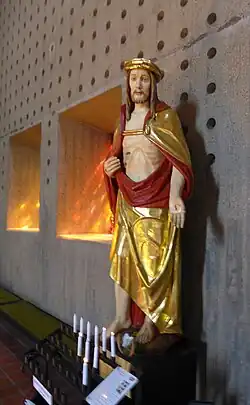 Erst im Jahr 1940 kehrten die Saarlouiser nach dem Ende des Frankreichfeldzuges in die entvölkerte Stadt zurück.[17] Aus Anlass der Heimkehr wurde im Jahr 1940 eine hölzerne Christusfigur als Votivgabe gestiftet und durch den in Koblenz tätigen Bildhauer Wilhelm Tophinke, der von seiner Ausbildung her der Wiedenbrücker Schule entstammte, geschaffen. Die Aufstellung der Figur erfolgte im Jahr 1941.