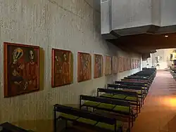 Der sich an den Grundriss der Vorgängerbauten abstrahierend anlehnende Innenraum mit seinen steil aufsteigenden, hochrechteckig segmentierten rohen Betonwänden spiegelt die äußere Gestalt als Negativform wider. Decken und einzelne Wandflächen sind aus gestalterischen und akustischen Gründen durch eine Lochrasterung abgesetzt. In der Höhe formen sich, aus der Wand heraustretend, Winkeln und Kanten sowie kubenartige Austritte und Einschnitte. Die wuchtig hervortretenden Gewölbeansätze aus kubischem Faltwerk leiten gestalterisch zur flach schließenden lochgerasterten Raumdecke über. Wände und Decke bilden eine untrennbare, plastisch gestaltete Einheit. Die zeltartige Auffaltung der Raumdecke greift eines der grundlegenden Leitmotive der deutschen Kirchenbaukunst der 1960er Jahre auf. Das Zelt-Motiv (z. B. 2 Kor 5,1-10 ) steht dabei als Symbol für die sogenannte „Ecclesia peregrinans“, die suchende oder pilgernde Kirche in der Zeit der pastoralen Neuorientierung im Umfeld des Zweiten Vatikanischen Konzils (1962–1965).[35] Darüber hinaus steht das Zelt-Motiv auch im Zusammenhang mit dem biblischen Mischkan (Stiftszelt; lat. tabernaculum, Ex 39,32-43 ), dem transportablen jüdischen Heiligtum, welches nach den Erzählungen des Alten Testamentes das Volk Israel auf seinen Wanderungen nach dem Auszug aus Ägypten mitführte, bevor ein permanentes Zentralheiligtum errichtet wurde.