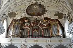 Die Decken- und Wandmalereien im Chor der Kirche entstanden im Jahr 1738. Sie wurden vom in Regensburg-Prüfening geborenen Maler Otto Gebhard geschaffen. Das Deckenbild im Chor zeigt die Berufung von Petrus und Andreas zu Aposteln. Das prachtvolle mit Schnitzereien verzierte Chorgestühl aus Eiche entstand zwischen 1748 und 1750 und wurde höchstwahrscheinlich vom Hofbildhauer Simon Sorg geschaffen. In 24 Reliefs berichtet es aus dem Leben des Heiligen Augustinus.[2]
