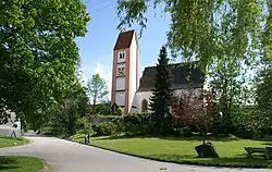 Die im 15. Jahrhundert erbaute Saalkirche besteht aus einem Langhaus, das 1685 nach Westen verlängert wurde, einem eingezogenen Chor mit Fünfachtelschluss im Osten und einem im Kern gotischen Chorflankenturm an der Nordwand des Chors, dessen oberstes Geschoss den Glockenstuhl mit drei Kirchenglocken und im Geschoss darunter die Turmuhr beherbergt. Darauf sitzt ein Satteldach. Der Innenraum des Langhauses ist mit einer Flachdecke überspannt, der des Chors mit einem Netzgewölbe.