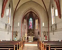 Der Innenraum der Eimersdorfer Kirche ist schlicht gehalten. Das vierteilig ausgeformte Kreuzrippengewölbe ruht im Schiff und im Chorbereich auf Konsolen. Nur an der Chorwand gehen die Gewölberippen in schlanke Runddienste über. Die Kämpfersteine sind mit kleinen Weinblättern verziert, die als Hinweis auf den früheren Weinbau im Niedtal gedeutet werden können.[8]