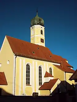 Das im Kern spätgotische Langhaus der Saalkirche wurde 1790/91 ausgebaut. Der eingezogene, flachrund geschlossene Chor im Osten wurde zeitgleich erneuert. Die unteren spätgotischen Geschosse des Chorflankenturms auf quadratischem Grundriss an seiner Nordwand wurden 1790/91 mit zwei achteckigen aufgestockt, um die Turmuhr im unteren und den Glockenstuhl im oberen Geschoss unterzubringen, und mit einer Zwiebelhaube bedeckt. An der Südseite des Langhauses wurde von Georg Hörmann 1746 eine Kapelle über der Gruft seiner Familie aus Kaufbeuren angebaut. Der Innenraum des Langhauses ist mit einem Stichkappengewölbe überspannt, das auf Pilastern ruht. Die Fresken, im Chor mit der Anbetung der Hirten und im Langhaus mit der Kreuzigung Christi, hat 1791 Georg Alois Gaibler gestaltet. Der Hochaltar wird von den Statuen des Ulrich von Augsburg und des Nikolaus von Myra flankiert. Das Altarretabel mit der Darstellung der Margareta von Antiochia wird Konrad Huber zugeschrieben. Die Orgel mit 13 Registern, verteilt auf zwei Manuale und einem Pedal wurde 2005 von Maximilian Offner gebaut.[1]