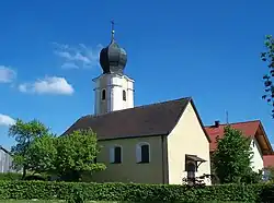 Die Saalkirche wurde 1733 anstelle des Vorgängers erbaut. Sie besteht aus einem Langhaus mit drei Fensterachsen, das mit einem Satteldach bedeckt ist, einem eingezogenen, halbrund geschlossenen Chor im Osten und einem mit einer Zwiebelhaube bedeckten Chorflankenturm an dessen Südwand. Der mit Pilastern an den Ecken verzierte Chorflankenturm beherbergt im oberen Bereich den Glockenstuhl.