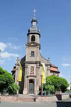 Das Langhaus der neobarocken Saalkirche wurde 1928 von Johann Adam Rüppel erneuert. Der Fassadenturm im Westen von 1771 blieb erhalten. Zwischen den Pilastern an den Ecken befindet sich das Portal, darüber in einer Nische die Statue der Margareta von Antiochia. Das oberste Geschoss des mit einer schiefergedeckten Welschen Haube bedeckten Fassadenturms beherbergt hinter den Klangarkaden den Glockenstuhl.