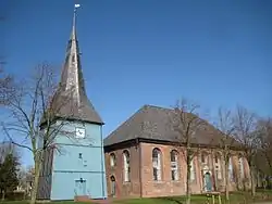 Die Saalkirche wurde 1784 aus Backsteinen erbaut. Sie besteht aus einem Langhaus von drei zu sieben Achsen, das mit einem Walmdach bedeckt ist. Freistehend vor der Westwand befindet sich ein hölzerner, viereckiger, konisch zulaufender Glockenstapel, der mit einem spitzen achtseitigen Helm bedeckt ist.