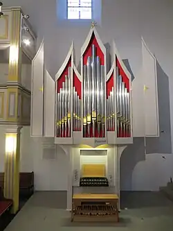 - Orgel auf der Westempore von 1796 (Umbauten 1954/55 und 1966); Chororgel („Johann-Walter-Positiv“) von 2021 vor den Stufen zum Chor