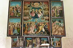 Bei aufgeklappten Flügeln sind auf den Tafeln links oben Märtyrer und Nothelfer zu sehen. Auf der unteren linken Tafel hat sich, neben der heiligen Apollonia von Alexandria (mit Zange und Zahn) und hinter der heiligen Katharina von Alexandrien (mit zerbrochenem Rad) und der heiligen Barbara von Nikomedien (mit Kelch und Hostie), Hans Schäufelin neben seinem Mitarbeiter selbst porträtiert. Die Tafeln der rechten Seite stellen oben die Kirchenlehrer Hieronymus und Gregor den Großen neben geistlichen Würdenträgern dar und unten das Fegefeuer. Nur bei geschlossenem Altar sind die vier Tafeln mit der Darstellung des heiligen Georg, des heiligen Christophorus, des heiligen Hieronymus und des heiligen Benedikt zu sehen. Die Außenseiten der Flügel sind mit Szenen der Leidensgeschichte Jesu (Jesus am Ölberg, Jesus vor Pilatus, Kreuzigung und Kreuzabnahme Jesu) versehen.