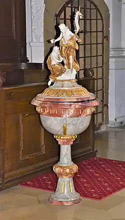 Die 1689 errichtete Kanzel stammt vermutlich vom Prospero Brennos Vetter Francesco Brenno. Den Korbboden bildet seine Perlmuschel – ein Mariensymbol. Die Perlmuschel wird durch vier Lilienbänder gegliedert. In den Zwischenräumen hängen üppige Fruchtgirlanden. Auf dem Muschelrand sitzen die die vier Evangelisten mit ihren Attributen.