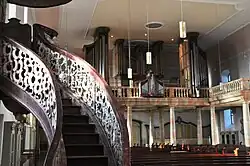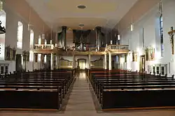 Das Hauptwerk befindet sich im Zentrum der Emporenbrüstung (sichtbar Prinzipal 8′). Seitlich davon sind die Pedaltürme erkennbar (sichtbar Prinzipal 16′). Über dem Spieltisch mit drei Manualen und Pedal (50 Register) befindet sich in einem Gehäuse das Schwellwerk.