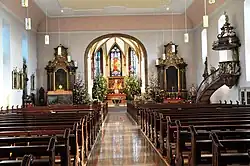 Die Empore wird von 12 Eichenstämmen, die in Marmoroptik gestaltet wurden, getragen. Im Kirchenraum finden sich zudem 14 Kreuzwegstationen auf Öl aus dem Jahre 1868, die von J. Mayr (München) gefertigt wurden sowie vier Nebenaltäre im Rokoko-Stil aus dem 18. Jahrhundert.[9]